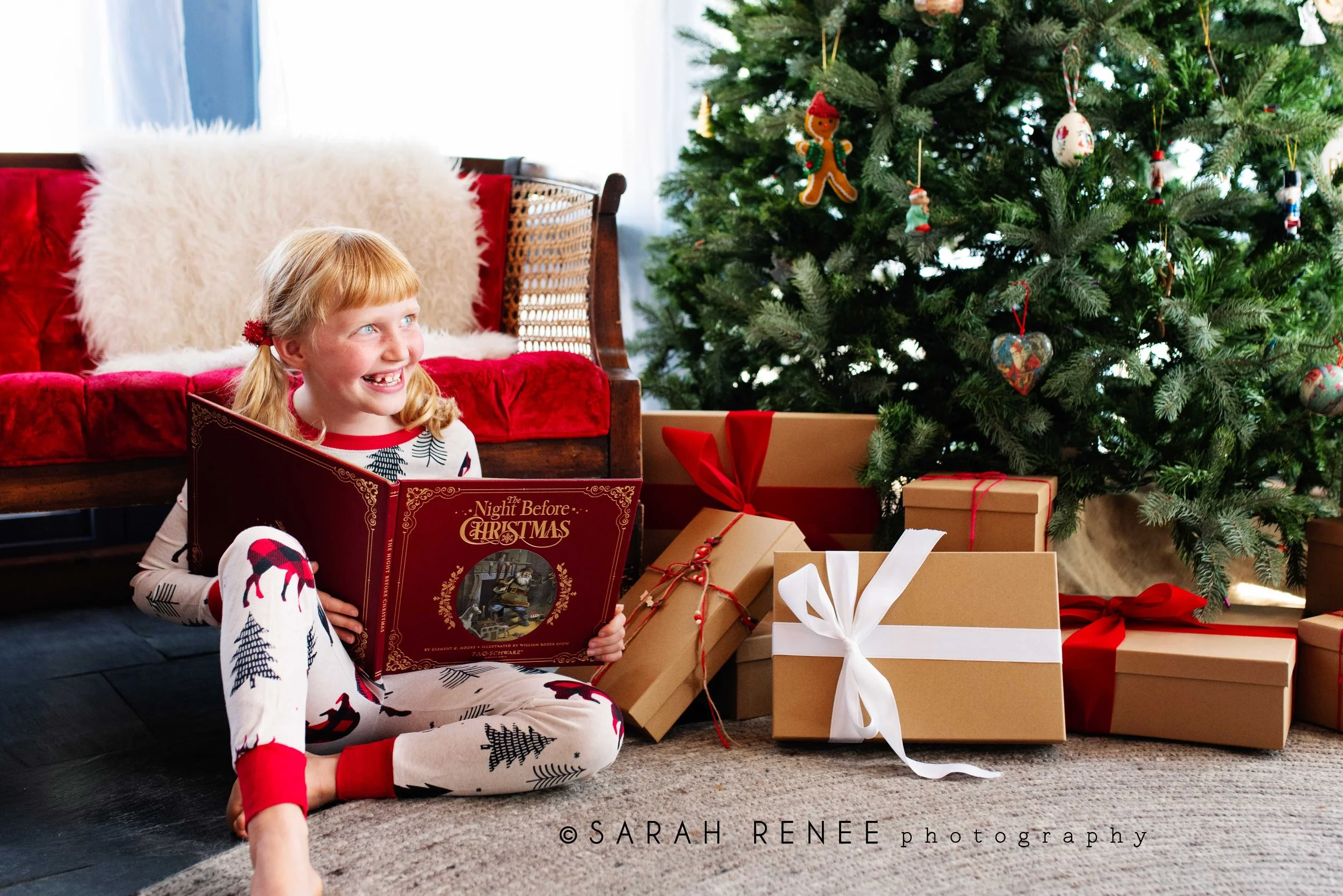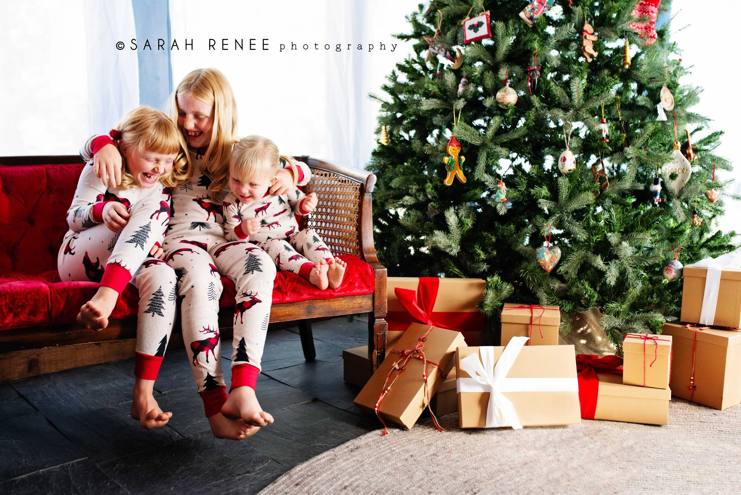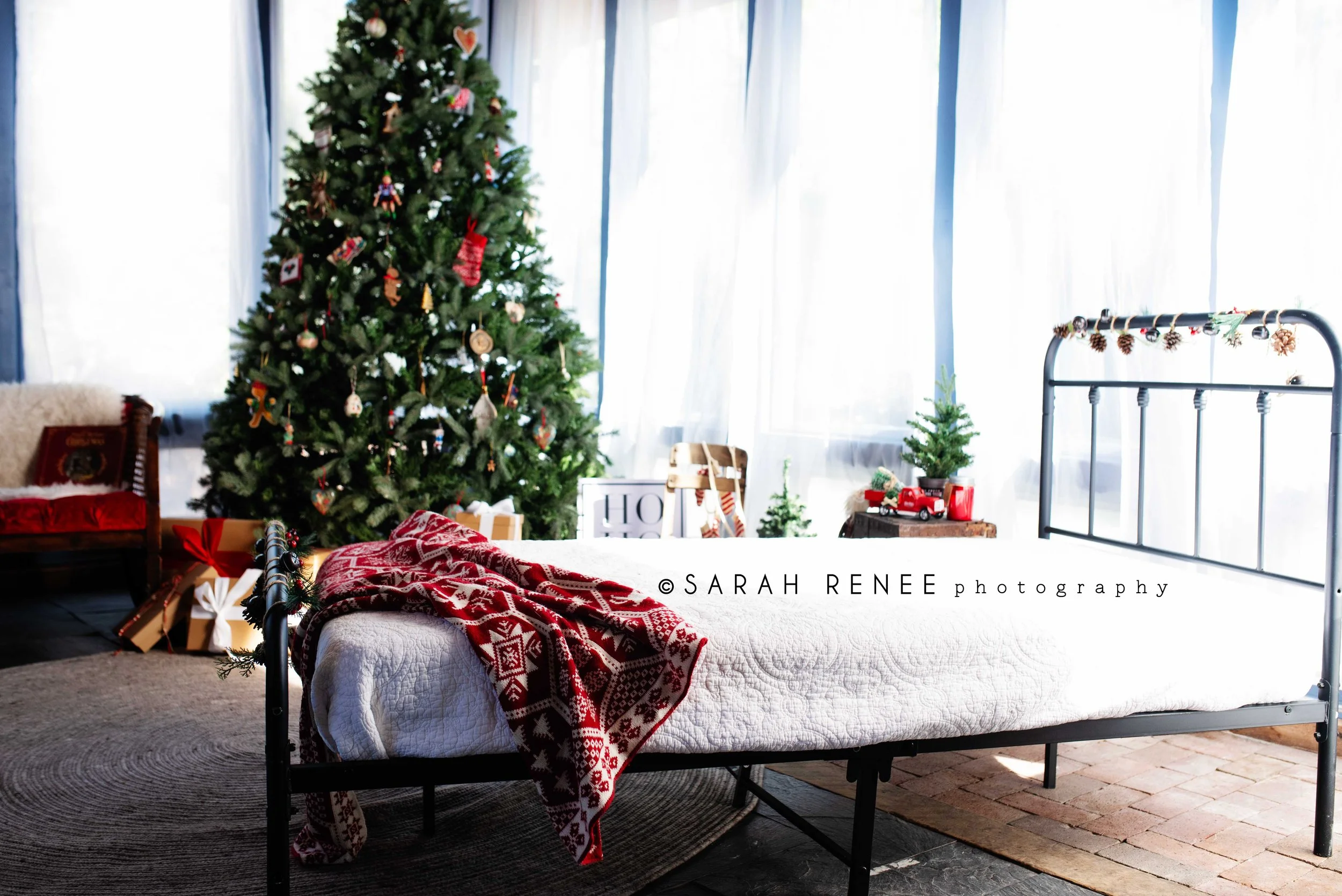 Crushed red velvet loveseat, wood-burning fireplace, 9-ft. decorated Christmas tree, black metal-framed twin bed, and various vintage props